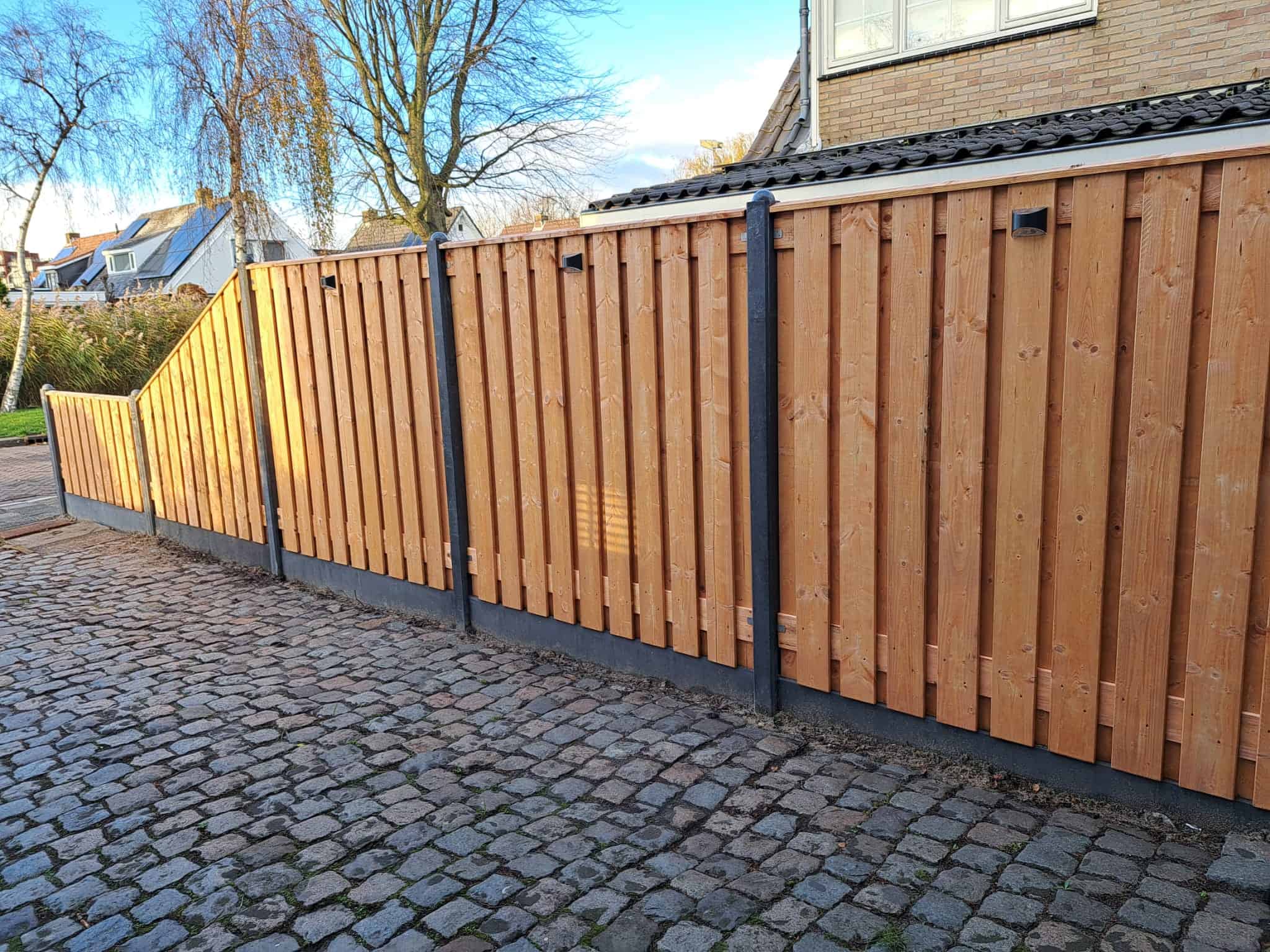 Vervolgens zijn de Caballero Wood® tuinschermen geplaatst: een combinatie van rechte schermen, een halfhoog paneel en een schuin aflopend scherm om mooi aan te sluiten op het hoogteverschil. De schutting is afgewerkt met luxe afdeklatten voor een nette, egale uitstraling.
